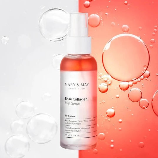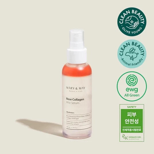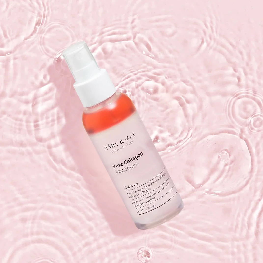 Mary & May Rose Collagen Mist Serum, 10,000ppm Rosa Damascena Flower Water + 10,000ppm Collagen, forms a skin moisture barrier to prevent natural water loss, maintaining a glowing complexion and revived skin with fine mist that allows the serum to quickly absorb into skin.