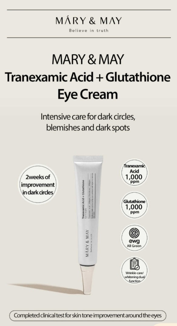 Mary & May Tranexamic Acid + Glutathione Eye cream, 1,000ppm tranexamic acid, 1,000ppm Glutathione for intensive care for dark circles in the eye contour.