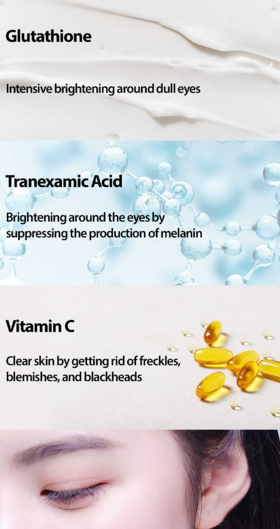 The combination of tranexamic acid and glutathione, a powerful antioxidant and melanin blocker brighten the dull tone around the eyes and improve uneven skin tone.