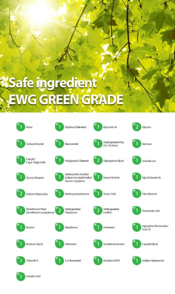 Water, Ethylhexyl Palmitate, Glycereth-26, Glycerin, Cetearyl Alcohol, Niacinamide, Hydrogenated Poly(C6-14 Olefin), Beeswax, Caprylic/Capric Triglyceride, Polyglyceryl-2 Stearate, Dipropylene Glycol, Isododecane, Glyceryl Stearate, Hydroxyethyl Acrylate/Sodium Acryloyldimethyl Taurate Copolymer, Stearyl Alcohol, Glycol Stearate SE, Sodium Polyacrylate, Hydroxyacetophenone, Stearic Acid, Dimethiconol, Dimethicone/Vinyl dimethicone crosspolymer, Hydrogenated Polydecene, Hydrogenated Lecithin, Tranexamic Acid (1,000ppm), Betaine, Glutathione (1,000ppm), Panthenol, Fragrance, Hippophae Rhamnoides Fruit Oil, Butylene Glycol, Adenosine, Sorbitan Isostearate, Caprylyl Glycol, Trideceth-6, 1,2-Hexanediol, Disodium EDTA, Sodium Hyaluronate, Ascorbic Acid