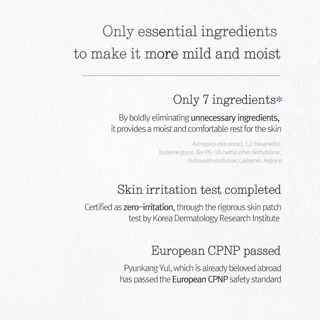 Formulated with only seven essential ingredients, this unique textured and viscosity toner that creates a dewy and soft complexion. Utilizing an Eastern Medicine formula made from naturally-derived ingredients, Pyunkang Yul Essence Toner is thoughtfully crafted to comfort and support sensitive skin, making it perfect for all skin types. Instead of plain water, Astragalus Root Water is used which includes betaine and various minerals that deliver deep moisture and maximum absorption. Improving skin elasticity, calming inflammation, and stimulating collagen production, this toner is free of artificial fragrances, colors, alcohol, parabens, and is never tested on animals. Its protective abilities reinforce skin barriers, soothe acne-prone skin, and are gentle on the most sensitive complexions.
