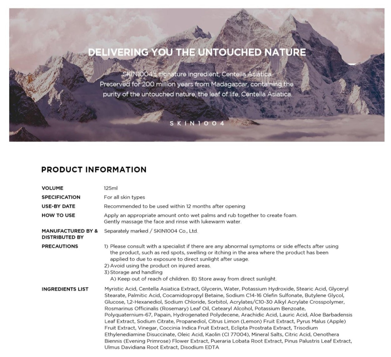 Myristic Acid, Centella Asiatica Extract(20.97%), Glycerin, Water, Potassium Hydroxide, Stearic Acid, Glyceryl Monostearate, Palmitic Acid, Cocamidopropyl Betaine, Sodium C14-16 Olefin Sulfonate, Butylene Glycol, Glucose, 1,2-Hexanediol, Sodium Chloride, Sorbitol, Acrylates/C10-30 Alkyl Acrylate Crosspolymer, Rosmarinus Officinalis (Rosemary) Leaf Oil, Cetearyl Alcohol, Potassium Benzoate, Polyquaternium-67, Papain, Hydrogenated Polydecene, Arachidic Acid, Lauric Acid, Aloe Babadensis Leaf Extract, Sodium Citrate, Propanediol, Citrus Limon Fruit Extract, Pyrus Malus (Apple) Fruit Extract, Vinegar, Coccinia Indica Fruit Extract, Eclipta Prostrata Extract, Trisodium Ethylenediamine Disuccinate, Oleic Acid, Kaolin, Mineral Salt, Citric Acid, Oenothera Biennis (Evening Primrose) Flower Extract, Pueraria Lobata Root Extract, Pinus Palustris Leaf Extract, Ulmus Davidiana Root Extract, Disodium EDTA