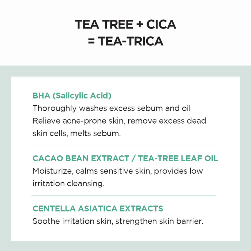 Water, Myristic Acid, Glycerin, Potassium Hydroxide, Stearic Acid, Glyceryl Monostearate, Propanediol, Lauryl Hydroxysultaine, Palmitic Acid, Sodium C14-16 Olefin Sulfonate, Potassium Benzoate, Salicylic Acid(0.45%), Butylene Glycol, Sorbitol, 1,2-Hexanediol, Sodium Chloride, Centella Asiatica Extract(0.2%), Acrylates/C10-30 Alkyl Acrylate Crosspolymer, Melaleuca Alternifolia Leaf Oil(0.2%), Cetearyl Alcohol, Melaleuca Alternifolia (Tea Tree) Leaf Water(0.09%), Melia Azadirachta Leaf Extract, Hydrogenated Polydecene, Arachidic Acid, Lauric Acid, Sodium Citrate, Melia Azadirachta Flower Extract, Trisodium Ethylenediamine Disuccinate, Oleic Acid, Theobroma Cacao Seed Extract,Dextrin, Citrus Acid, Disodium EDTA, Pentylene Glycol, Caprylyl Glycol, Chamaecyparis Obtusa Water, Pinus Palustris Leaf Extract